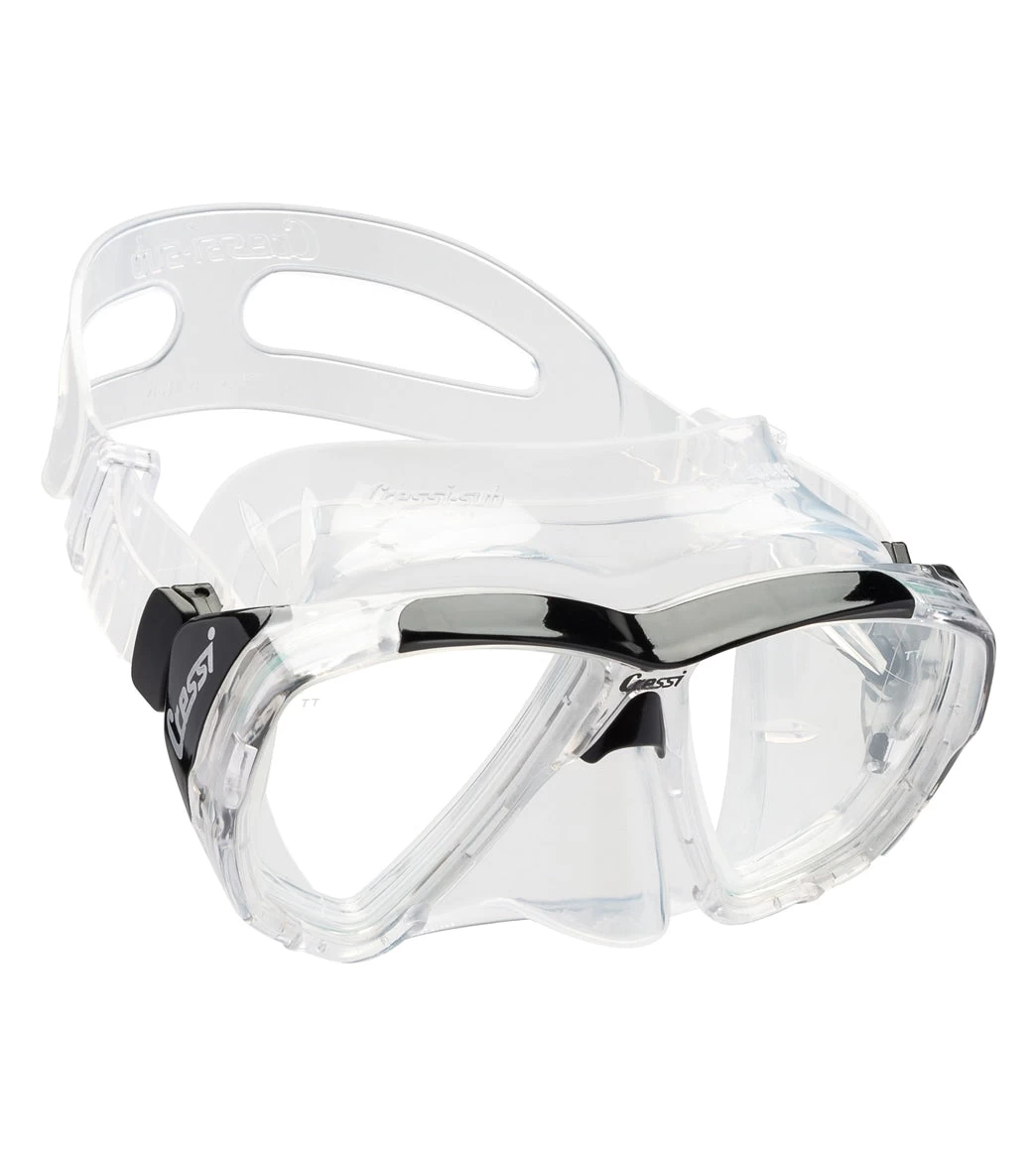 Introducing the mask that completely revolutionised the sector because it introduced new and exclusive principles that are likewise milestones: the Big Eyes Snorkeling Mask. For the first time in the world, the lenses are not parallel to the face but are raked and shaped like an “inverted drop”, with a very unusual development, the geometry of which is covered by a worldwide patent.