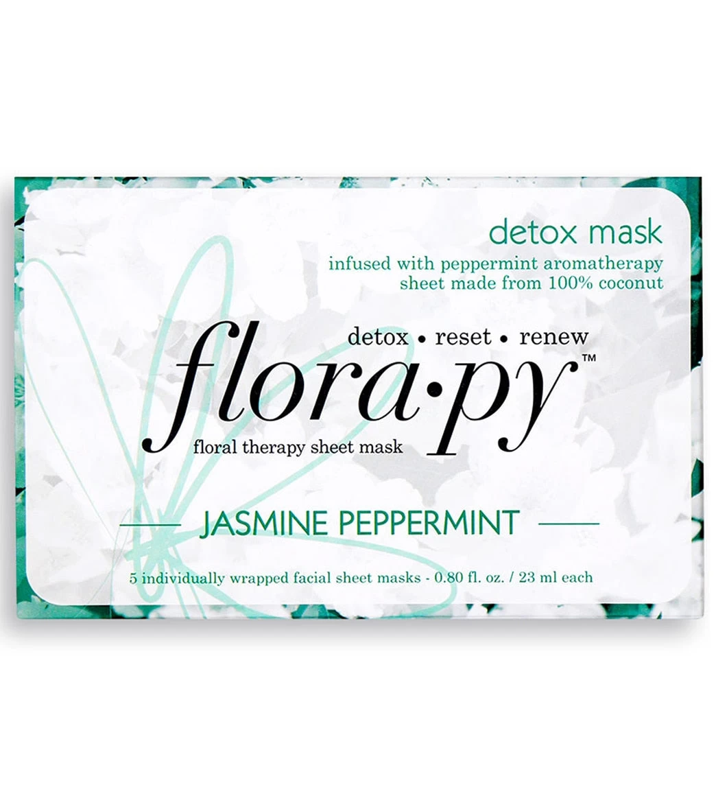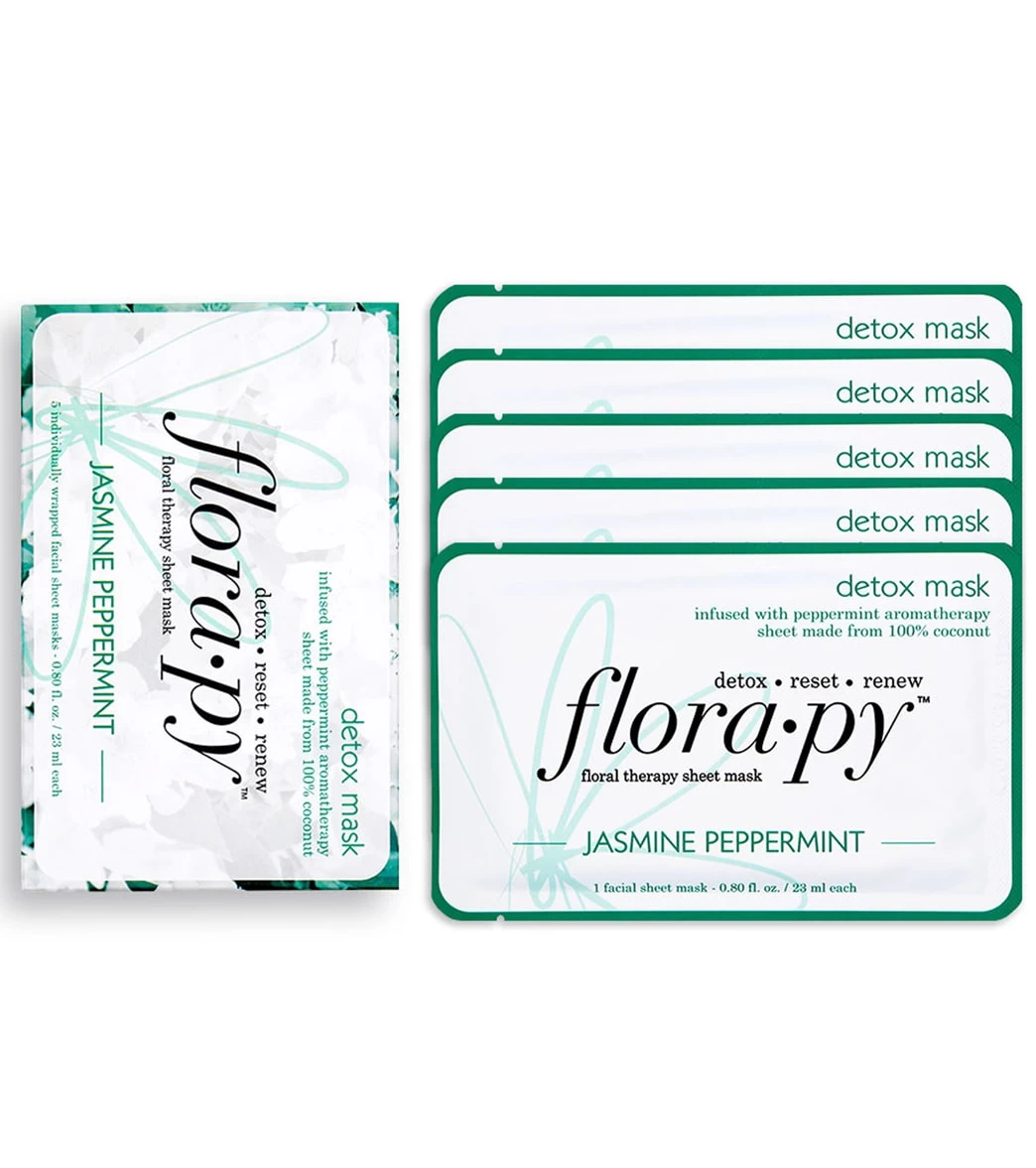 Destress and unwind with the Florapy Detox Aromatherapy Sheet Mask 5 Count, Jasmine Peppermint.