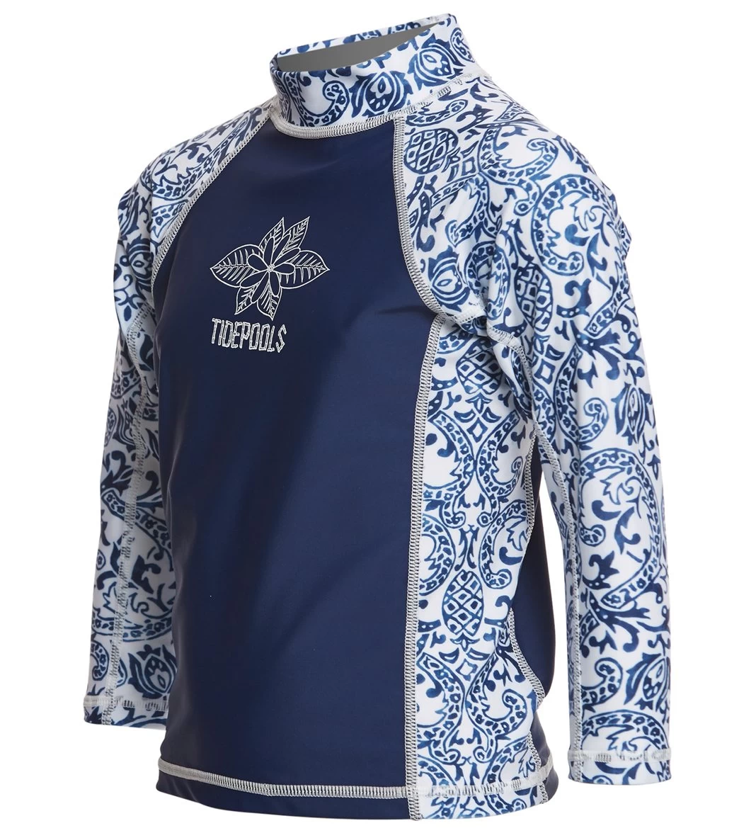 Let her stay safe from the sun while looking cute. The Tidepools Girls Pineapple Long Sleeve UV 50+ Rashguard features an adorably paneled print along the sides and high neck. Its front boats an adorable logo print.