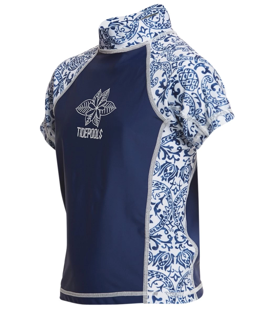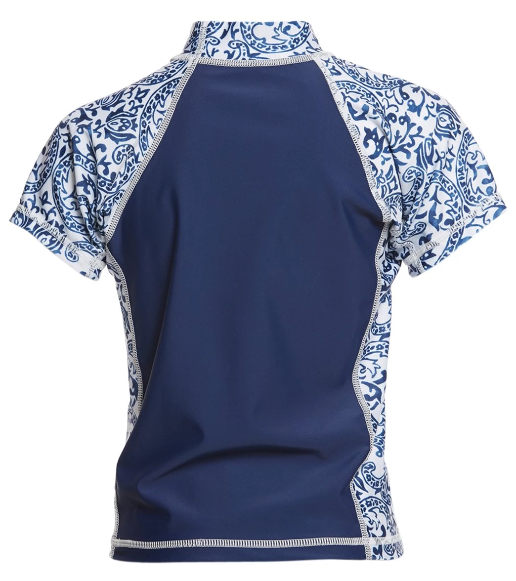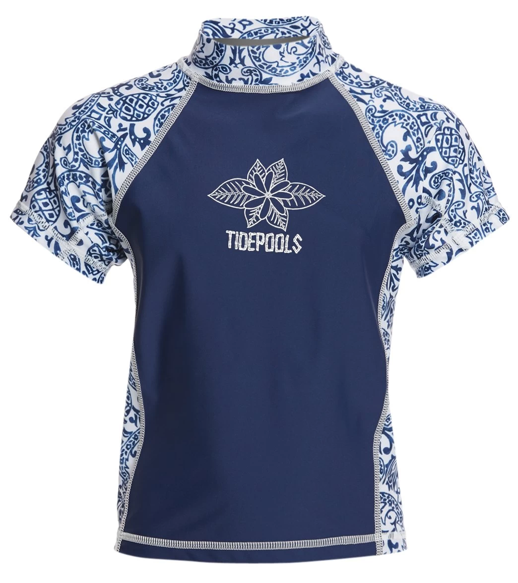 Let her stay safe from the sun while looking cute. The Tidepools Girls Pineapple Short Sleeve UV 50+ Rashguard features an adorably paneled print along the sides and high neck. Its front boats an adorable logo print.