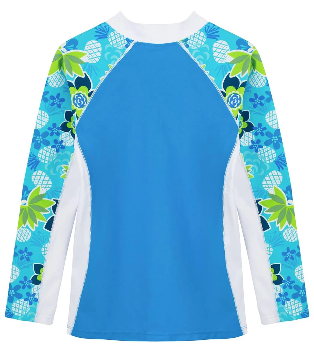 The Tuga Girls’ Tropical Punch Shoreline Long Sleeve Rash Guard features long sleeves and a high neck for optimal sun protection. This color blocked rashguard is made of soft, lightweight, quick dry, 4-way stretch fabric for comfort and convenience.