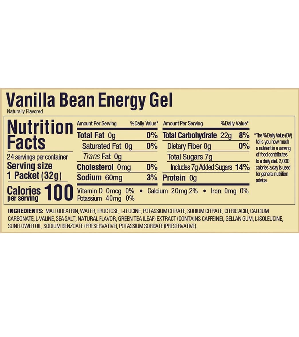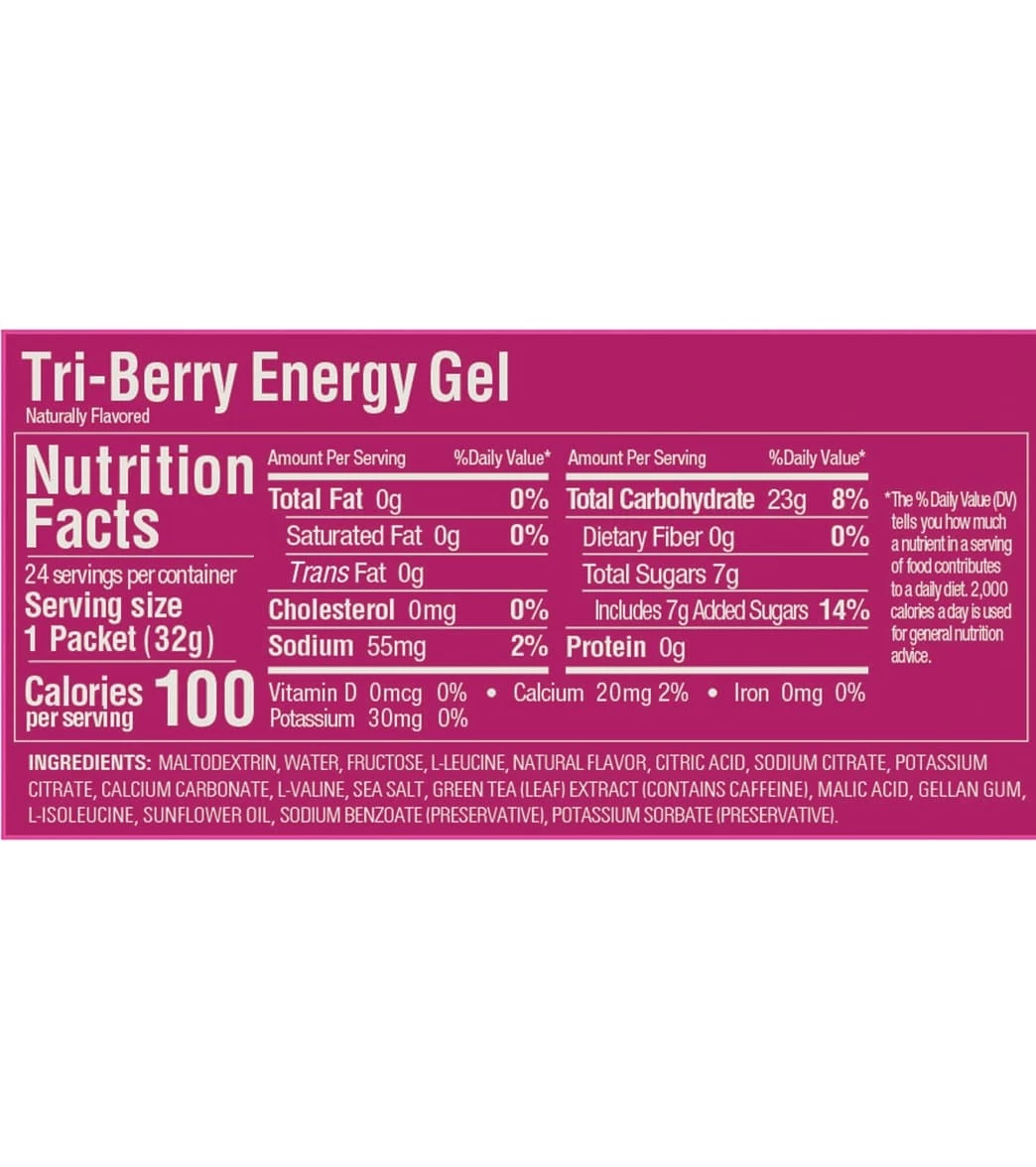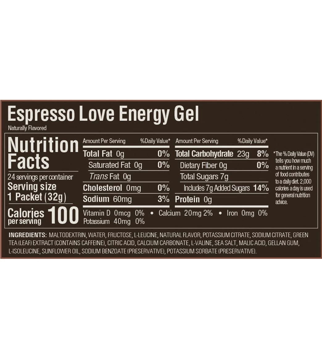 Maltodextrin, Water, Fructose, Peanut Butter (Peanuts, Salt), Organic Cocoa Liquor, Leucine, Sea Salt, Sodium Citrate, Potassium Citrate, Valine, Ascorbic Acid (Vitamin C), Calcium Carbonate, Histidine, Green Tea (Leaf) Extract (Contains Caffeine), Sodium Benzoate (Preservative), Calcium Chloride, Fumaric Acid, Potassium Sorbate (Preservative), d-alpha-Tocopheryl Acetate (Vitamin E), Pectin Powder, Isoleucine, Citric Acid, Malic Acid, Ginger Extract, Chamomile Extract. 20-40mg of caffeine.