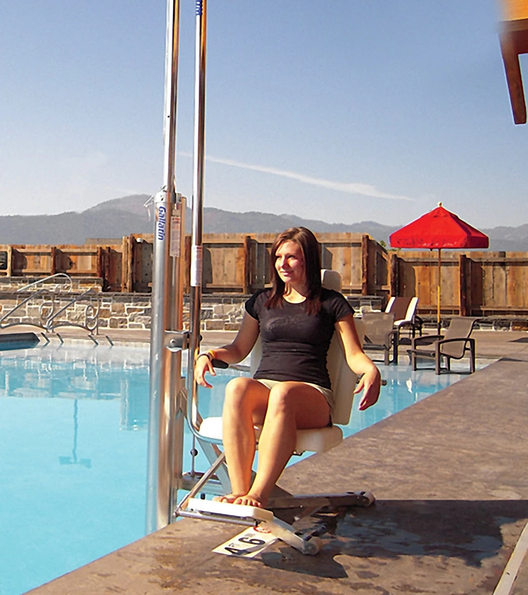 - Water-Powered Lift Benefits: – ADA and Title 24 Compliant. – Minimum 400 lb lifting capacity. – Powered by large diameter cylinder and piston for faster and more powerful lifting capacity. – Made from all stainless steel construction (304L Grade). – Coated with SpectraShield® for maximum corrosion protection. – Self operable from deck and water with waterproof remote control. – Spacious seat with excellent lumbar support. – Designed for ease of transport with built-in wheels for portability. – Runs on standard 55 psi water pressure. – Quiet and stable operations. – Designed for in-ground and above-ground pools and spas. – Base stand design that accommodates high loading capacity with minimal deflection.